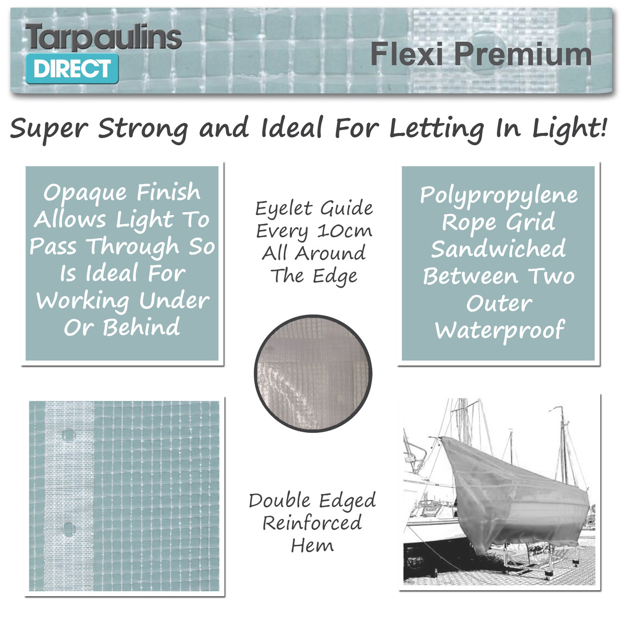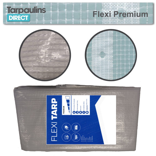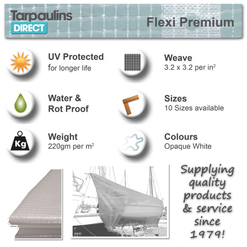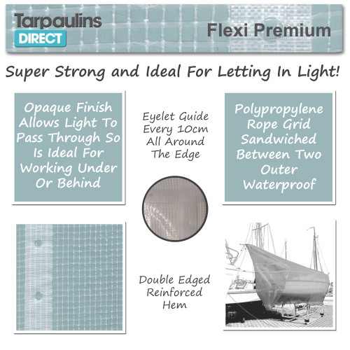 The design of the tarp means that although not see through they allow a lot of light to pass and so are ideal for working under or behind. The tarp weighs 220 grammes per square metre and is constructed of a polypropylrene rope grid sandwiched between two outer waterproof layers. The Flexi Tarp does not come with eyelets, but it does have guides for eyelets every 10cm so you can fit your own if required.